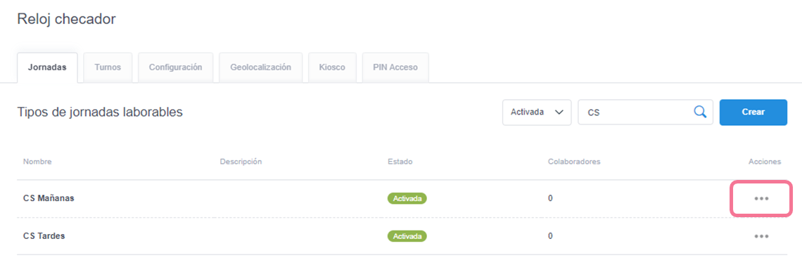 1. En la pestaña de "Jornadas", encontrarás el listado con todas las jornadas Generales creadas. Al lado derecho de cada jornada, hay un icono de 3 puntos. Coloca el ratón sobre ellos.