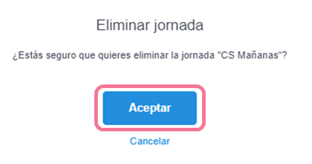 2. Aparecerá una ventana emergente solicitando confirmación para eliminar la jornada. Ten en cuenta que, al eliminarla, todos los usuarios que tenían esta jornada asignada quedarán sin una jornada asignada. Si estás seguro de proceder, haz clic en "Aceptar" para eliminar la jornada del listado.
