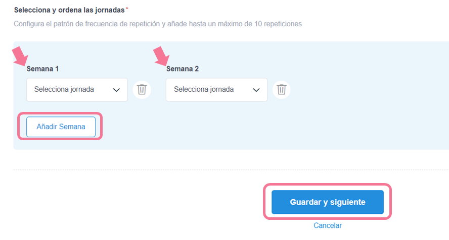 3. Ahora debes configurar el patrón jornadas. Escoge en cada semana que "Jornada" debe realizarse.