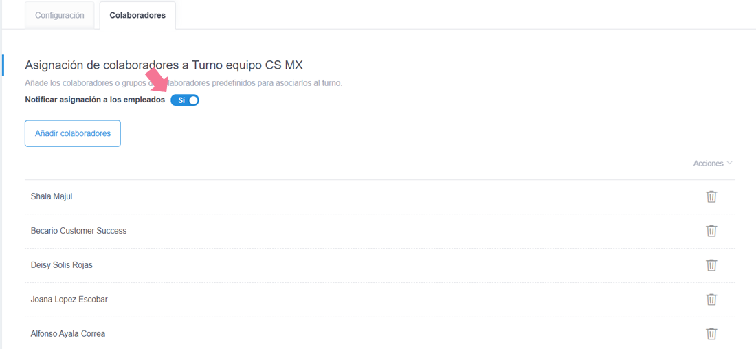 En la pestaña de "Colaboradores" aparecerá el listado de colaboradores asignados al turno.