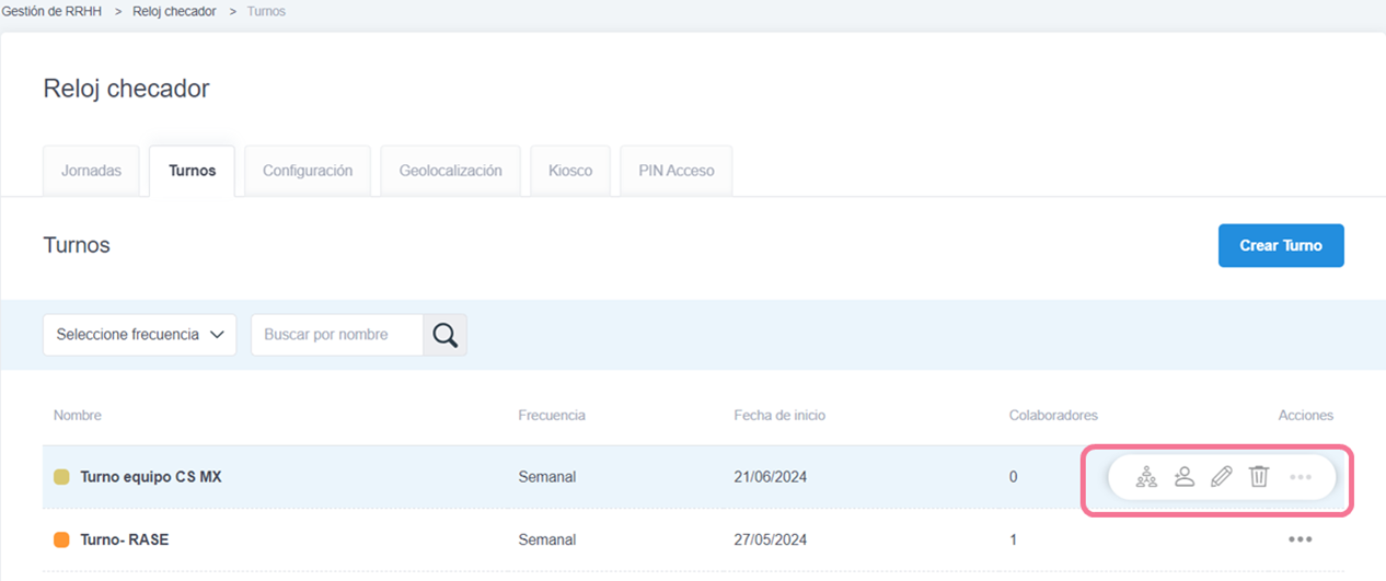 1. En caso que fuese necesario editar o eliminar el turno o colaboradores, puedes acceder a la edición desde el listado de turnos en la pestaña de "Turnos" en la configuración de "Control horario".