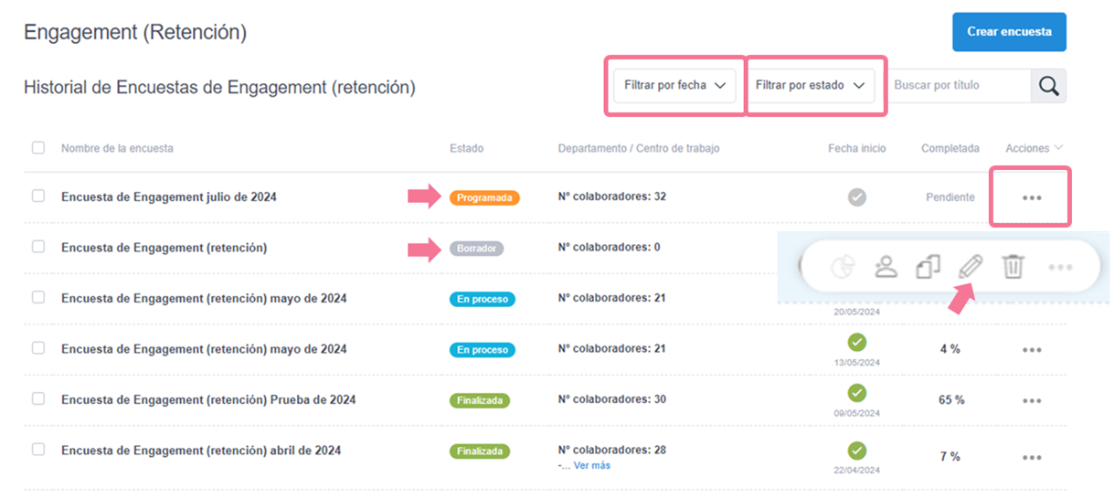 1. En el "Historial" encontraras todas les encuestas de Engagement creadas con su estado.