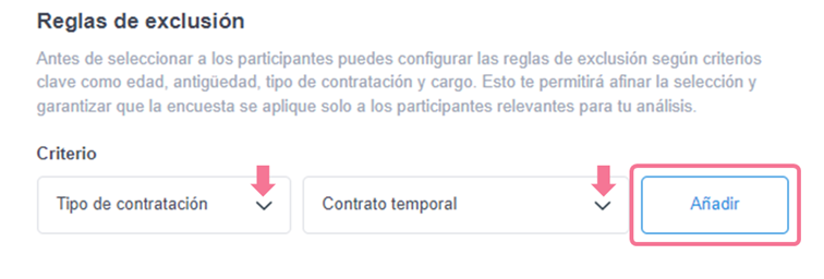 Antes de seleccionar a los participantes puedes configurar las reglas de exclusión según criterios clave como edad, antigüedad, tipo de contratación y cargo. Esto te permitirá afinar la selección y garantizar que la encuesta se aplique solo a los participantes relevantes para tu análisis.
