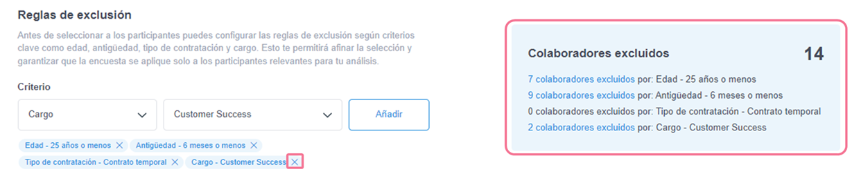 5. A la derecha de los criterios seleccionados podrás ver estos mismos con un enlace para ve el listado de colaboradores excluidos.