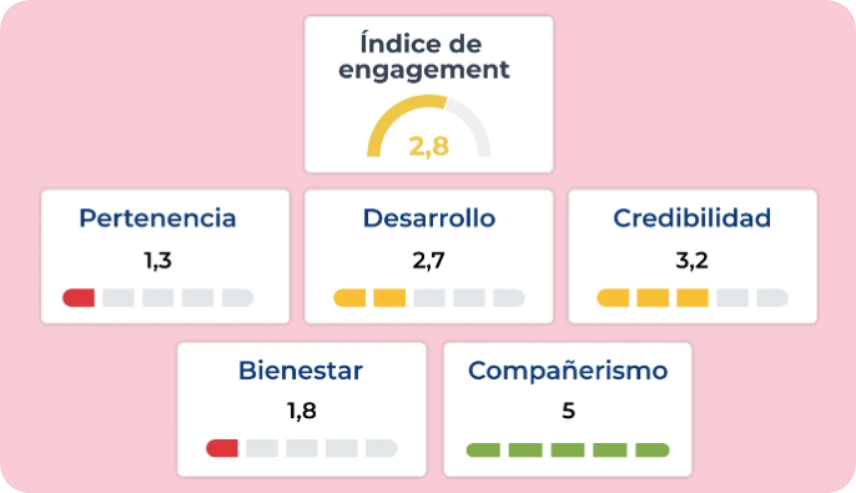 Lo que hace único a nuestro módulo de Engagement es que va más allá de simplemente recopilar datos. Este mide el grado de compromiso de tus colaboradores, te ayuda a identificar los principales insights que influyen en el bienestar de tus empleados con el objetivo de mejorar la retención de talento en tu empresa.