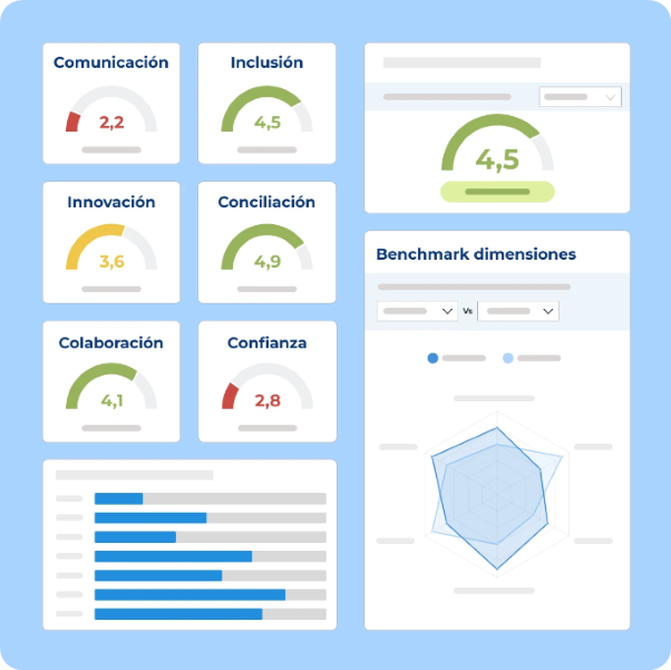 Además, se evalúan 8 índices centrados en visión y las fortalezas de la empresa, (Engagement, eNPS, Comunicación, Inclusión, Innovación, Conciliación, Colaboración y Confianza), proporcionando así un análisis más profundo de las áreas de oportunidad y mejora de tu empresa.