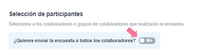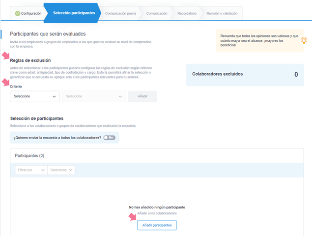 *Nota: En el ejemplo actual trabajaremos con todos los colaboradores. Para aprender la aplicación de los filtros avanzados o los criterios de exclusión ir al artículo: Guía de selección de participantes avanzada de Engagement