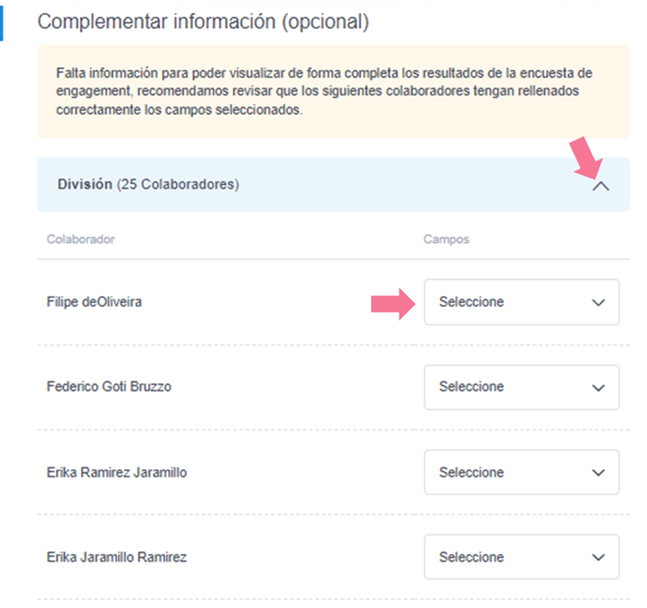 4. En el caso de que los perfiles de los participantes no estén completos, la plataforma te indicara que información no esta informada.