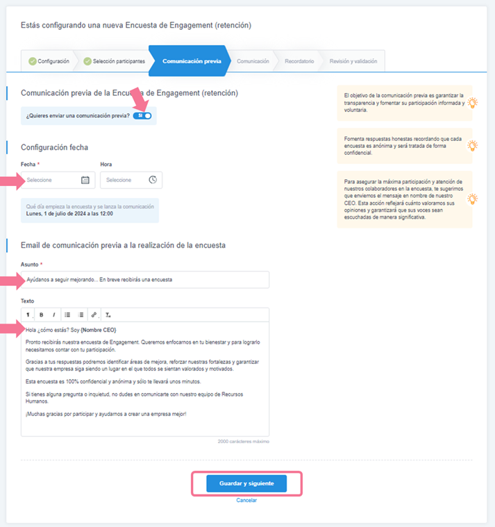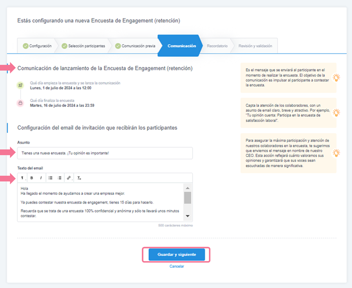 1. En este paso puedes editar el email que se enviará a los colaboradores el día en que se lance la encuesta y este disponible para realizarla.