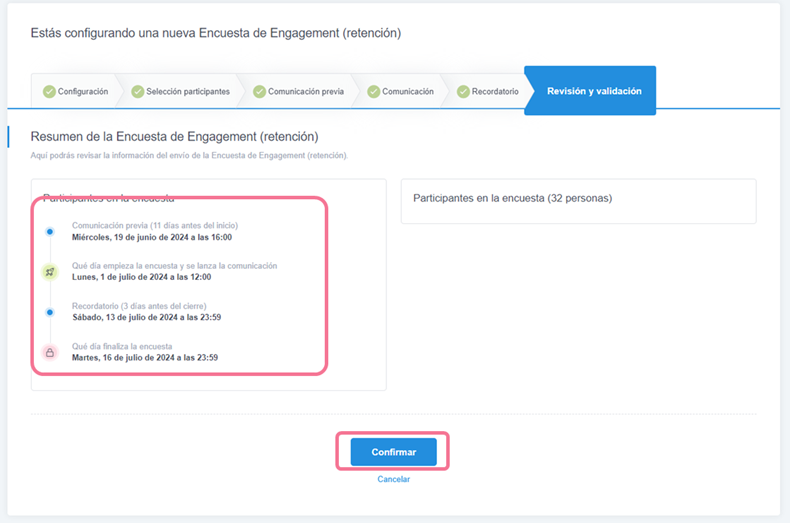 1. En este ultimo paso, aparecerá un resumen en formato "timeline" con las fechas de los envíos calendarizados, el inicio y final de la encuesta y el total de participantes de la misma.
