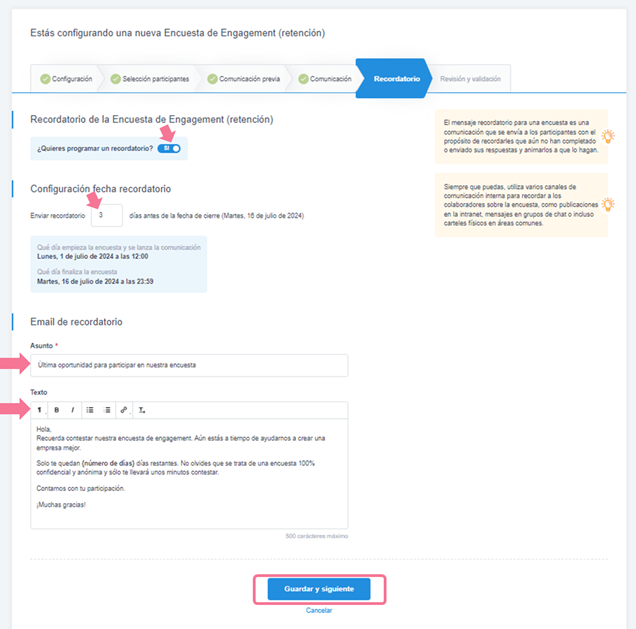 1. A continuación debemos configurar los recordatorios que se van a enviar entre la fecha de inicio de la encuesta y los posteriores 15 días con el objetivo de incrementar la participación de los colaboradores.