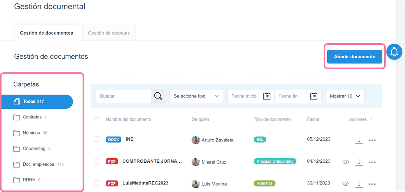 2. Para añadir un nuevo documento al expediente de un colaborador, haz clic en el botón Añadir documento de la derecha.