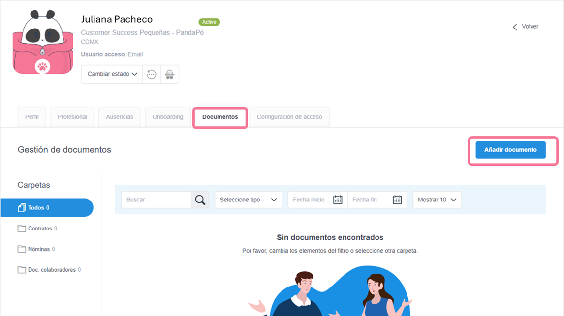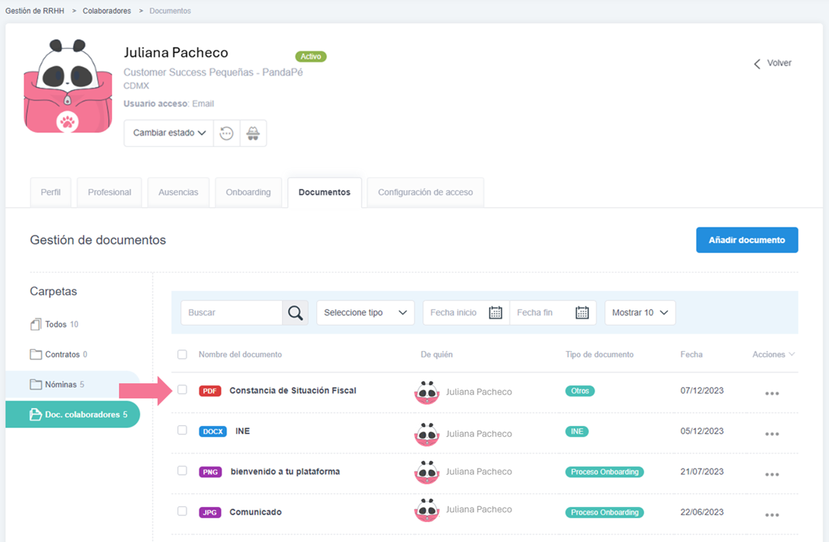 1. En el perfil del colaborador, ve a la pestaña de "Documentos"