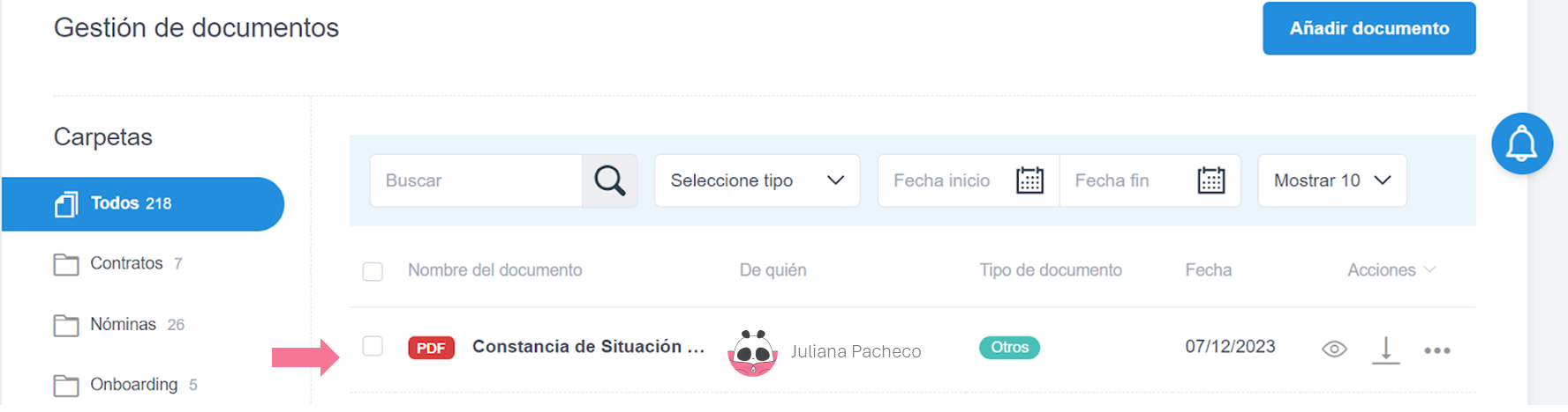 1. Una vez añadido el documento lo encontrarás en el listado en "Gestión de documentos", el perfil de colaborador y en la pestaña de "Mis documentos" del colaborador.