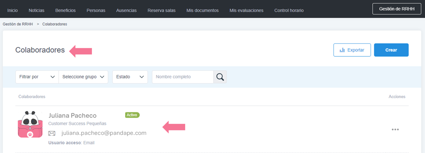 1. Accede a "Colaboradores" a través de: Gestión de RRHH> Colaboradores>Listado
