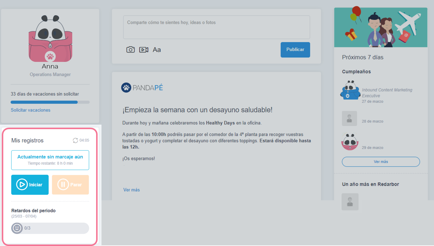3. Una vez iniciada la jornada, Pandapé HCM cambiará tu estatus a "Actualmente trabajando".