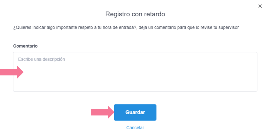 4. En caso de que a tu jornada se le apliquen retardos, aparecerá un pop-up para poder notificar el motivo de tu retardo que se enviará a tu manager o supervisor.