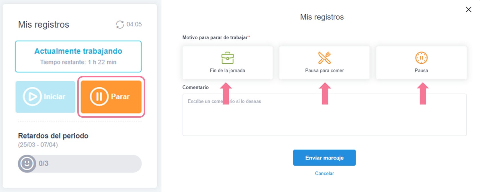 1. Durante tu jornada, podrás realizar diferentes tipos de pausa, como “Fin de la Jornada”, “Pausa para comer” o “Pausa”. Para poder seleccionar los diferentes tipos de pausa, haz clic en el botón “Parar". Un pop-up aparecerá donde podrás elegir el tipo de pausa que requieres.