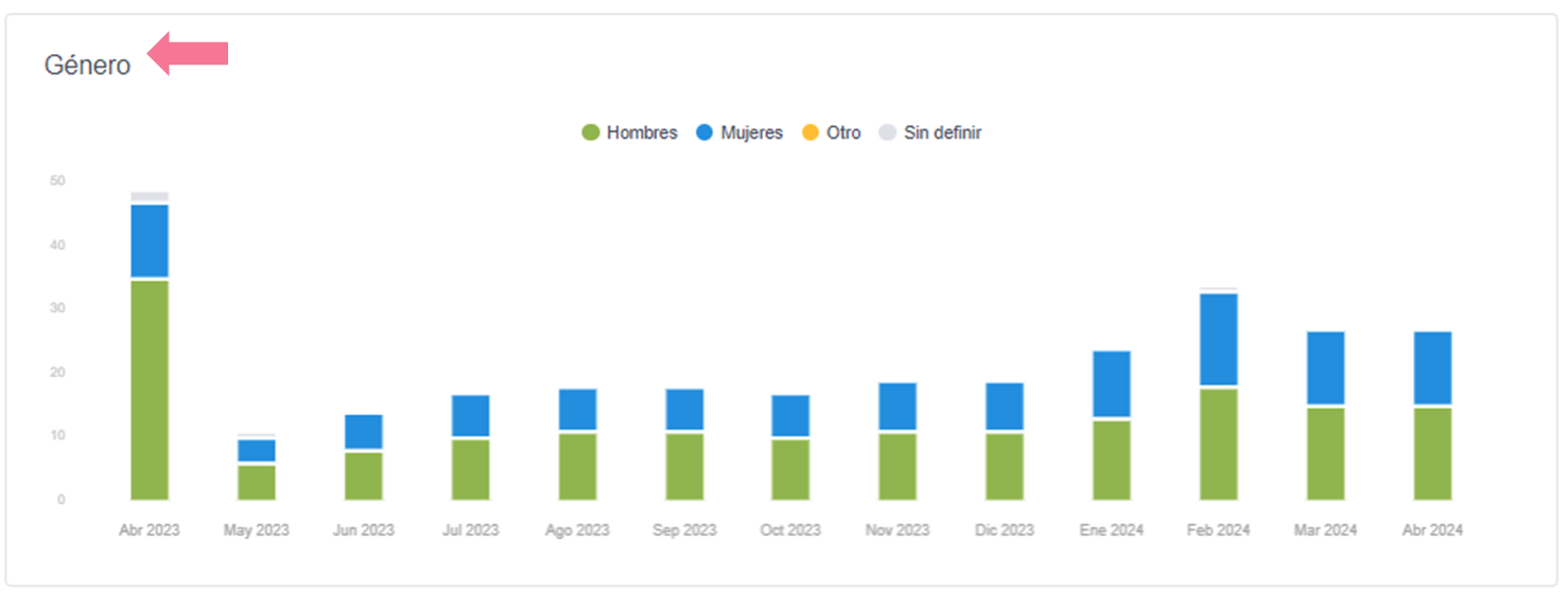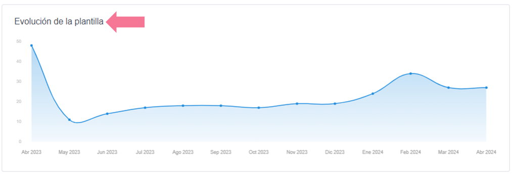 - Evolución de la plantilla: esta gráfica te permite medir durante los últimos 12 meses como ha crecido o disminuido el total de colaboradores de tu compañía.