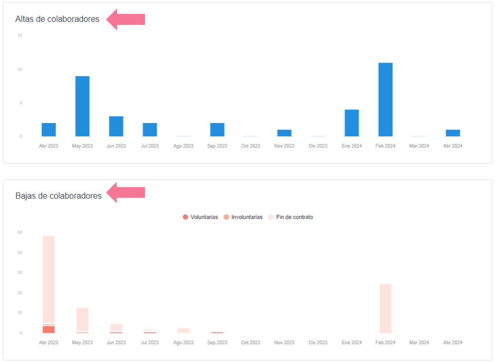 - Bajas de colaboradores: Muestra el total de bajas por tipología mes a mes durante los últimos 12 meses en una gráfica de barras.