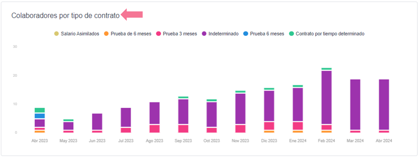- Colaboradores por tipo de contrato: Muestra la cantidad de empleados activos en la compañía de acuerdo a los tipos de contrato que tengas registrados.