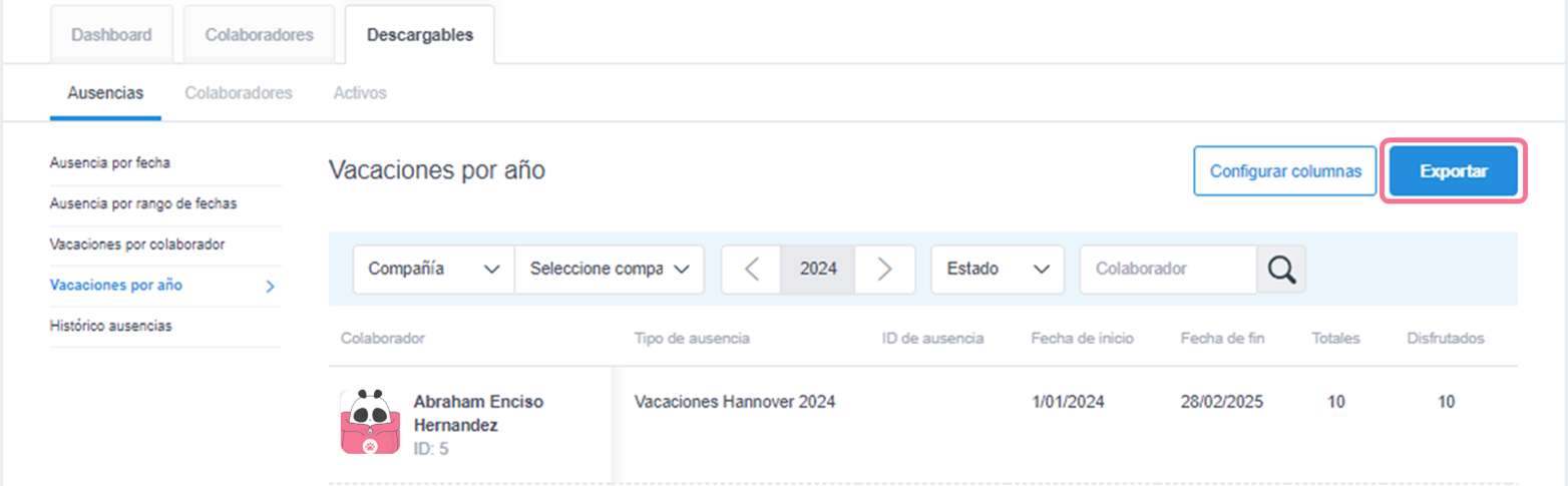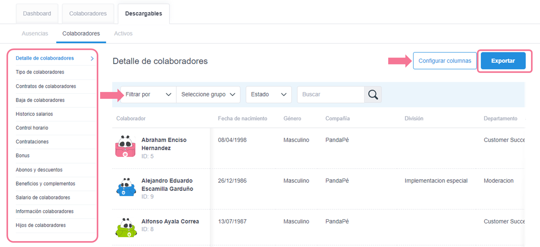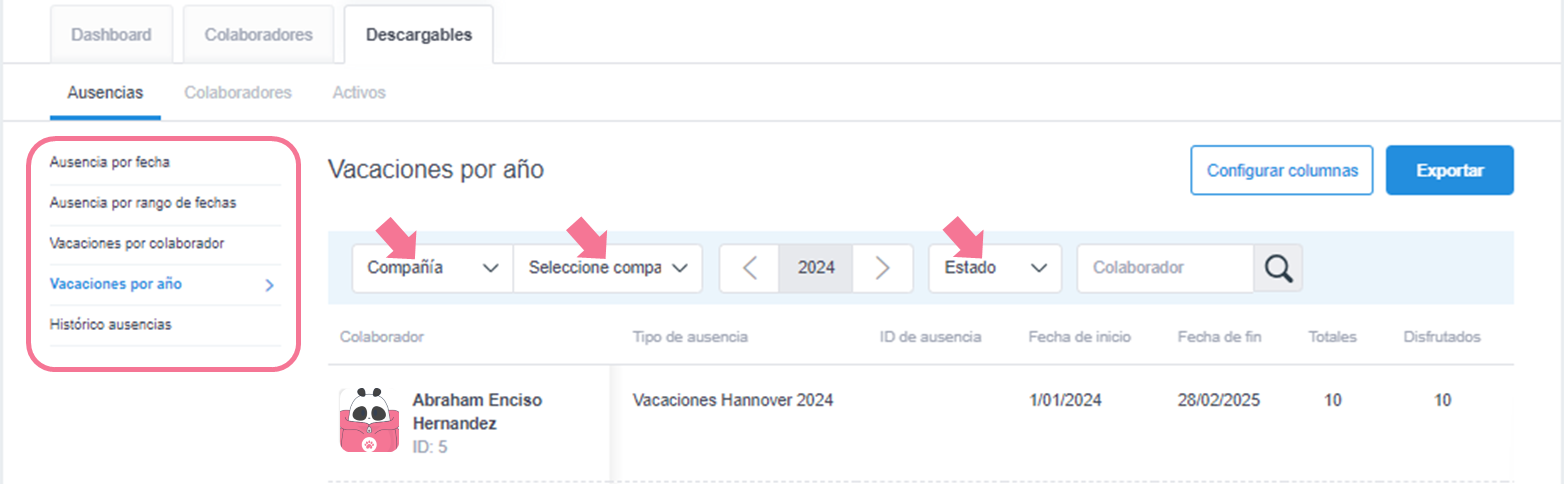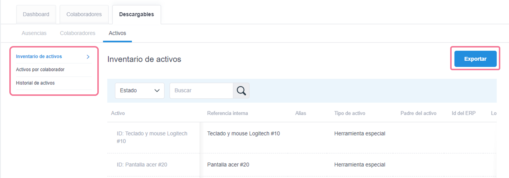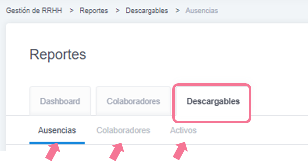 2. En la sección de Descargables, dependiendo de los módulos adquiridos y tus permisos, tendrás acceso a Reportes de Ausencias, Reportes de colaboradores y Reportes de Activos.