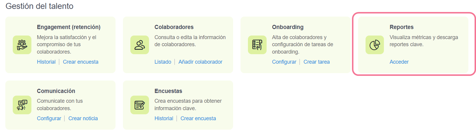 1. Cuando hayas iniciado sesión, ve al módulo de “Reportes” a través de: Gestión de RRHH> Gestion del talento> Reportes> Acceder