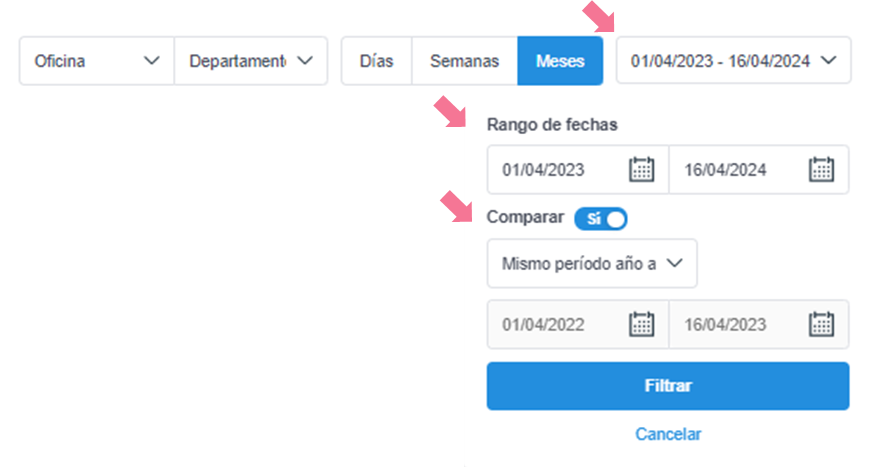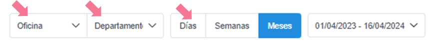 3. Podrás segmentar los distintos indicadores por Oficina y Departamento. Además de visualizar los gráficos a distintos intervalos de tiempo (Días, Semanas, Meses).