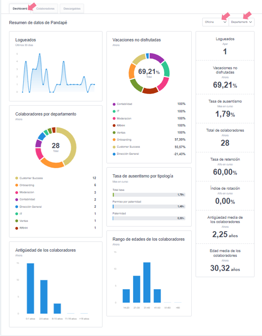 3. Podrás segmentar los indicadores por oficina o departamento desde los filtros de la parte superior derecha.