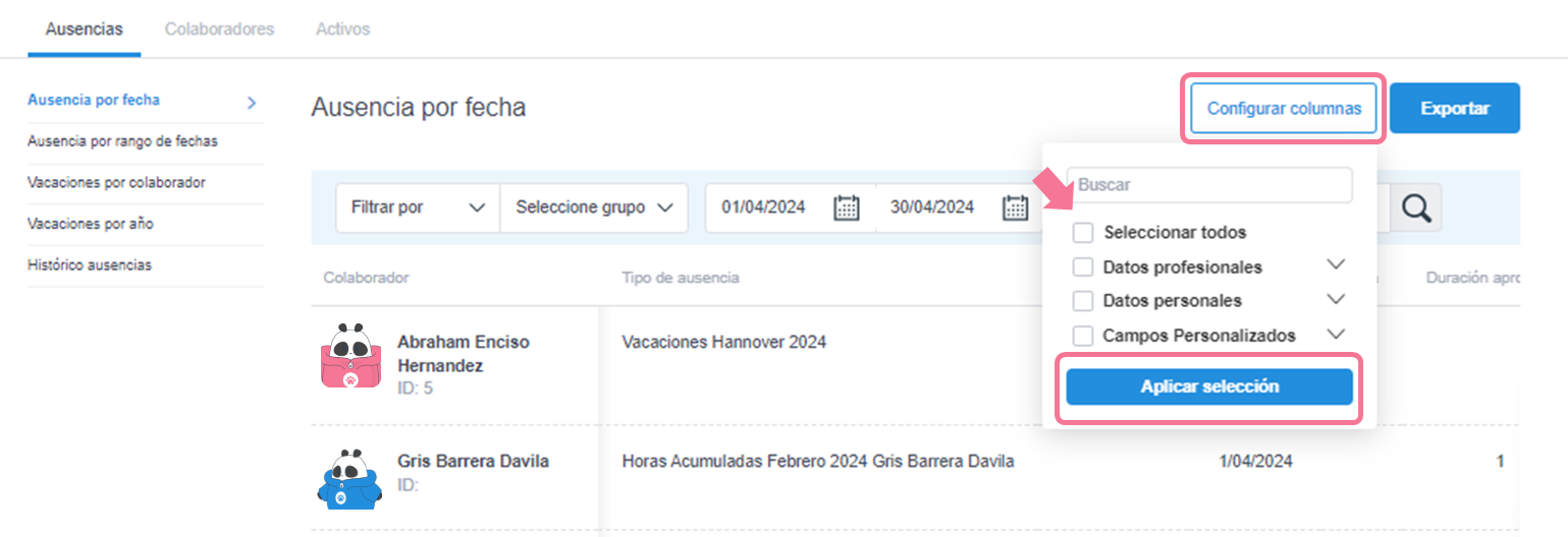 4. Selecciona las columnas que quieres incluir y haz clic en "Aplicar selección"
