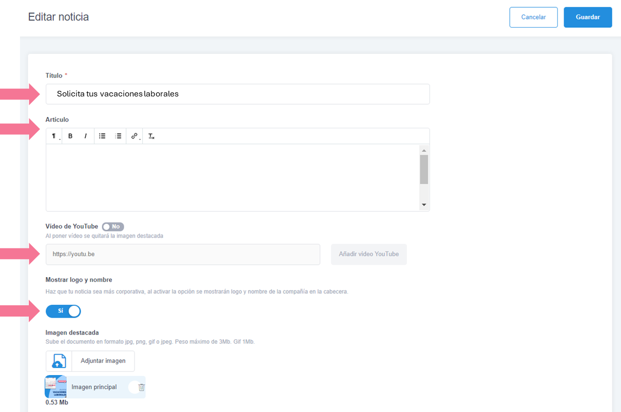3. A continuación encontrarás toda la información que estableciste cuando se configuró la noticia. Puedes modificar cualquier parámetro, después de realizar los cambios. Haz clic en Guardar al final.