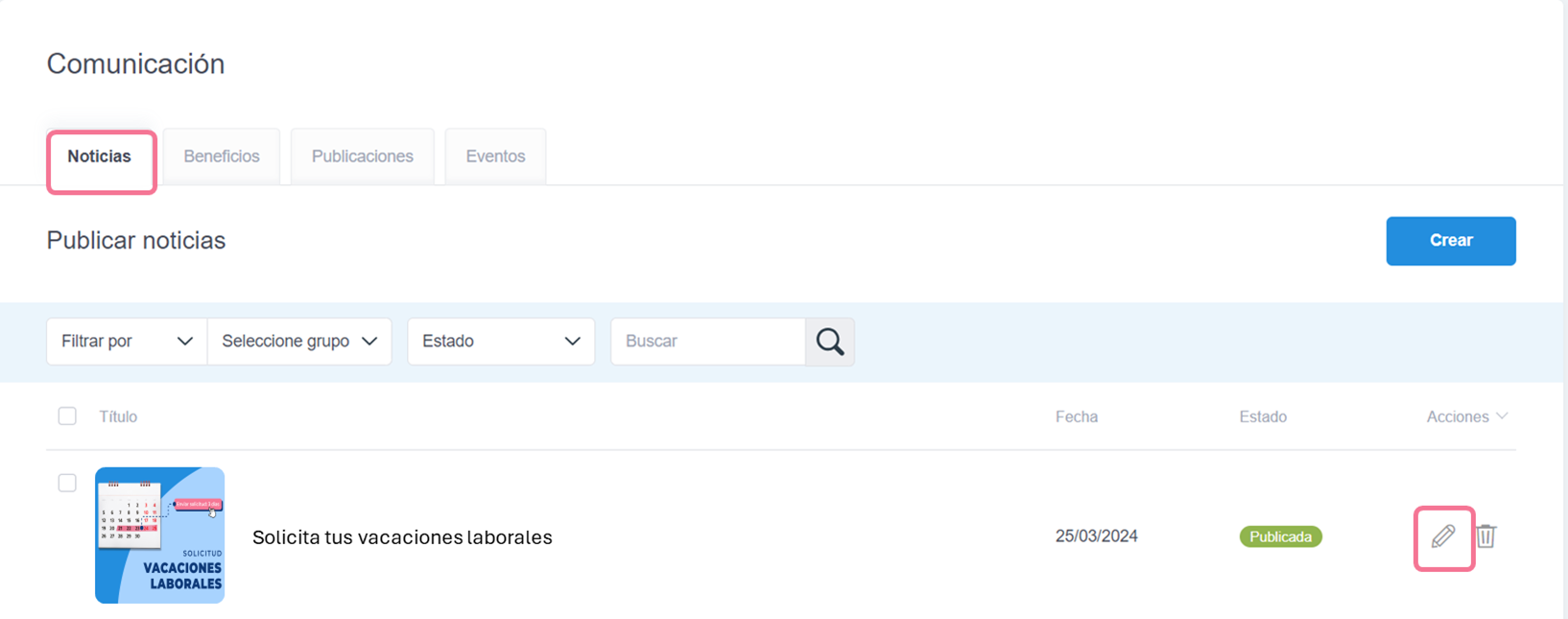 2. Una vez en noticias, verás el listado de noticias creadas, acompañadas de una foto, título, fecha de publicación, estado y acciones (Editar y borrar). Haz clic en Editar (lápiz).