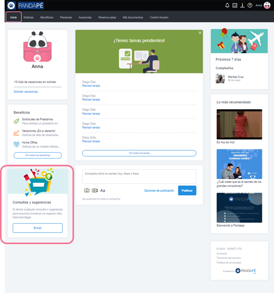 1. Cuando hayas iniciado sesión, ve al apartado de "Consultas y sugerencias" en la parte izquierda de tu muro.