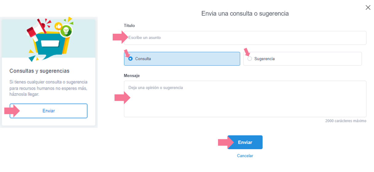 3. Escoge el tipo de mensaje (consulta o sugerencia). Si escoges sugerencia, el mensaje puede enviarse de forma anónima.