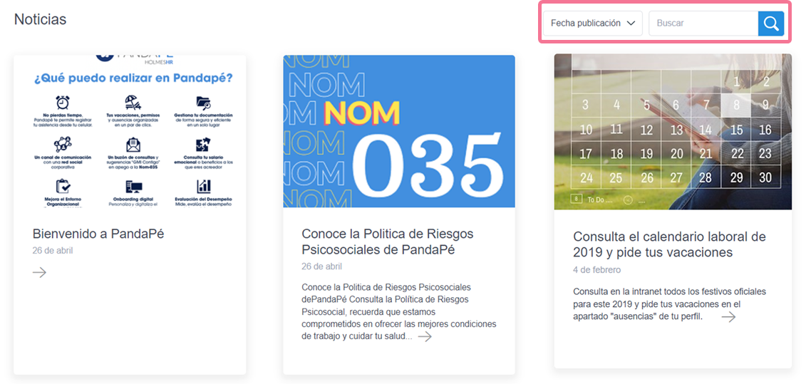 2. En el área de noticias encontrarás todas las noticias cronológicamente ordenadas. Además las podrás filtrar por fecha o encontrarlas más rápidamente desde el buscador.