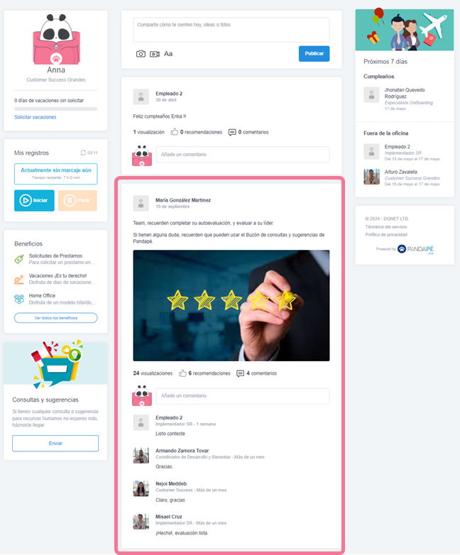 1. Cuando hayas iniciado sesión, en el muro de inicio encontrarás todas las noticias y publicaciones ordenadas cronológicamente.