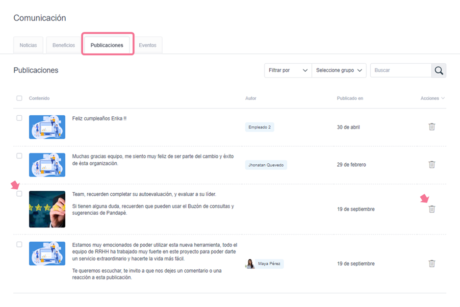 2. En la pestaña de publicaciones, visualizarás el listado de publicaciones hechas por los colaboradores, acompañado de una fotografía, el contenido, el autor, la fecha de publicación y la acción de eliminar. Haz clic en el botón eliminar.