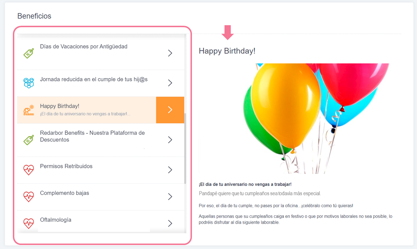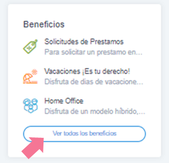 1. En el área de Beneficios encontrarás un listado a la izquierda, dónde están agrupados todas las facilidades y beneficios que te ofrece tu compañía.